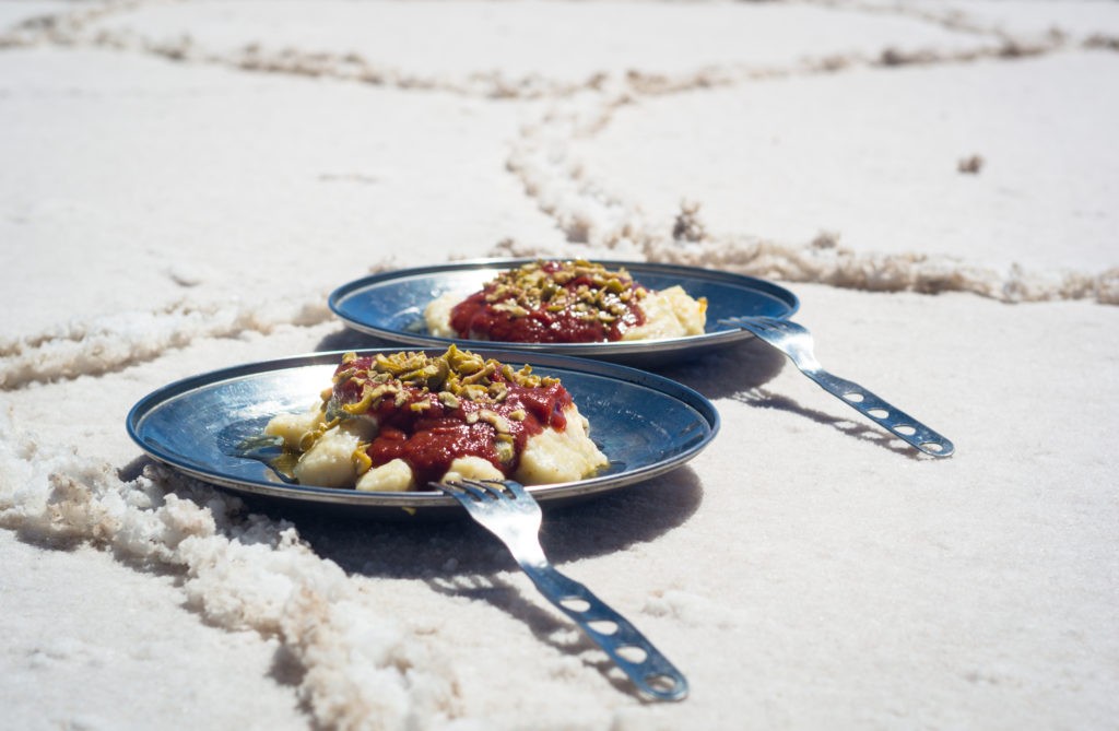 Nous nous sommes tournés vers des pros de la cuisine système D : un couple de cyclistes parti faire le tour du monde à vélo avec un réchaud et des produits secs de base dans leurs sacoches. Caroline Lopez, designeuse culinaire et compagne d’Anthony Laguerre, a choisi de nous parler de sa confection de gnocchis en pleine campagne sous la pluie en Corée du Sud. Une recette idéale pour cuisiner à vélo reproduite plusieurs fois, comme au beau milieu du désert en Bolivie…