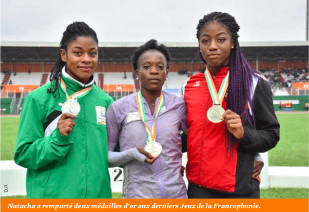 Athlète originaire de Pointe-Noire en République du Congo, Natacha Ngoye Akamabi s’est révélée dans son pays et à l’inter- national grâce à sa prestation aux VIIIes Jeux de la Francophonie. A 23 ans, la sprinteuse atteste sa progression au sein de l’élite du sprint continental. Après les Jeux de la Francophonie, elle a participé aux Championnats d’Afrique d’Asaba au Nigéria et a atteint la finale du200m(23s63). En 2019, elle a remporté le Grand Prix de la Confédération africaine d’athlétisme à Yaoundé (Cameroun) et a amélioré par la même occasion son record personnel dans ses deux disciplines phares, notamment le 100 m (11 s 41) et le 200 m (23 s 04). Parmi ses compétitions notoires, on peut citer les Jeux Africains de Rabat au Maroc en 2019 où elle a décroché la 4e place. Natacha Ngoye Akamabi a aussi participé aux Jeux mondiaux militaires à Wuhan la même année et a décroché la 5e place du200m(23s 65)et la 7e place du 100 m (11 s 81). La sprinteuse travaille toujours à améliorer son record personnel.