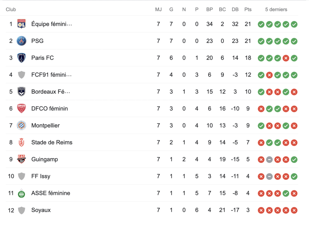 Ce week-end se tenait la 7e journée de championnat de football féminin. Cette journée a été l’occasion pour le Paris FC de s’imposer face au FF Issy 5-0, tandis que l’Olympique Lyonnais s’est largement défait de Soyaux sur le score de 1-6. De leur côté, les joueuses de Montpellier ont battu l’ASSE féminine 1-2. Retrouvez ci-dessous l’ensemble des résultats.