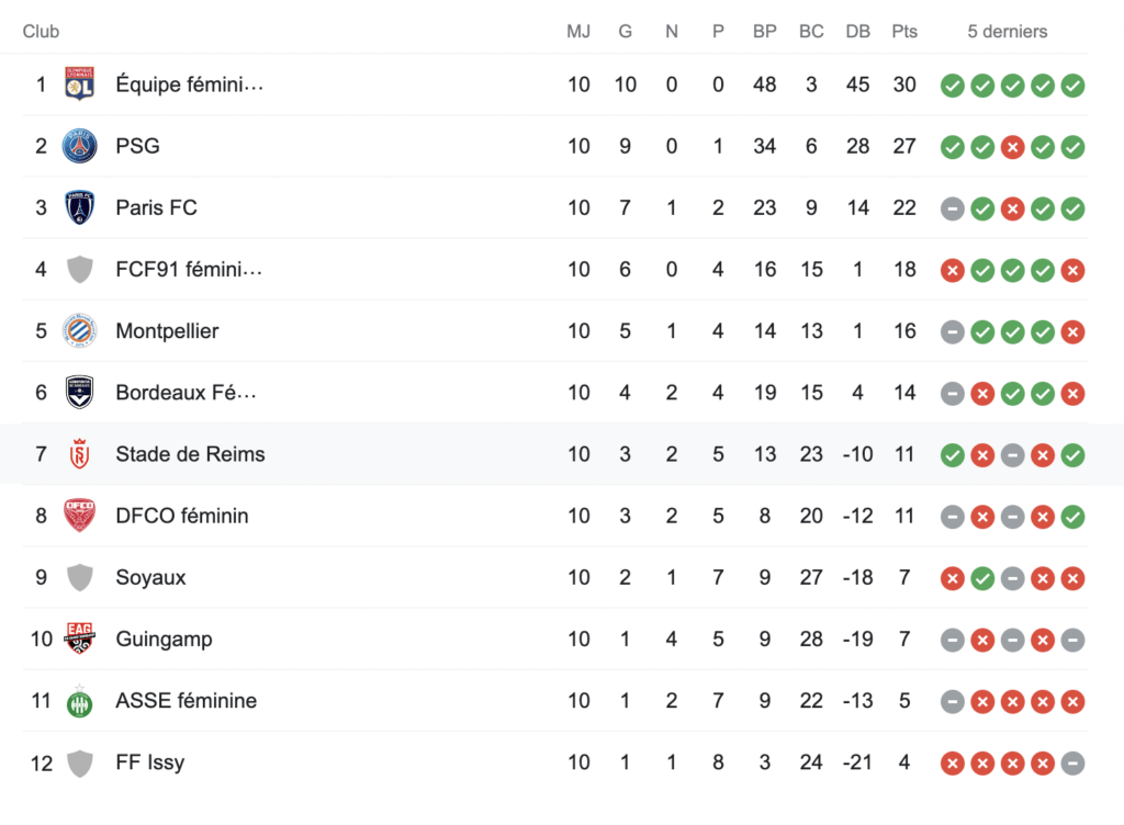 Ce week-end se tenait la 10e journée de championnat de football féminin. Cette journée a été l’occasion pour l’Olympique Lyonnais de s’imposer face au FCF91 (4-0) pour la 200e d’Amandine Henry, tandis que le PSG a battu le FF Issy (0-3). Guingamp et l’ASSE se sont quant à eux quitter sur un nul (1-1), tout comme Bordeaux et le DCFO. Retrouvez ci-dessous l’ensemble des résultats.