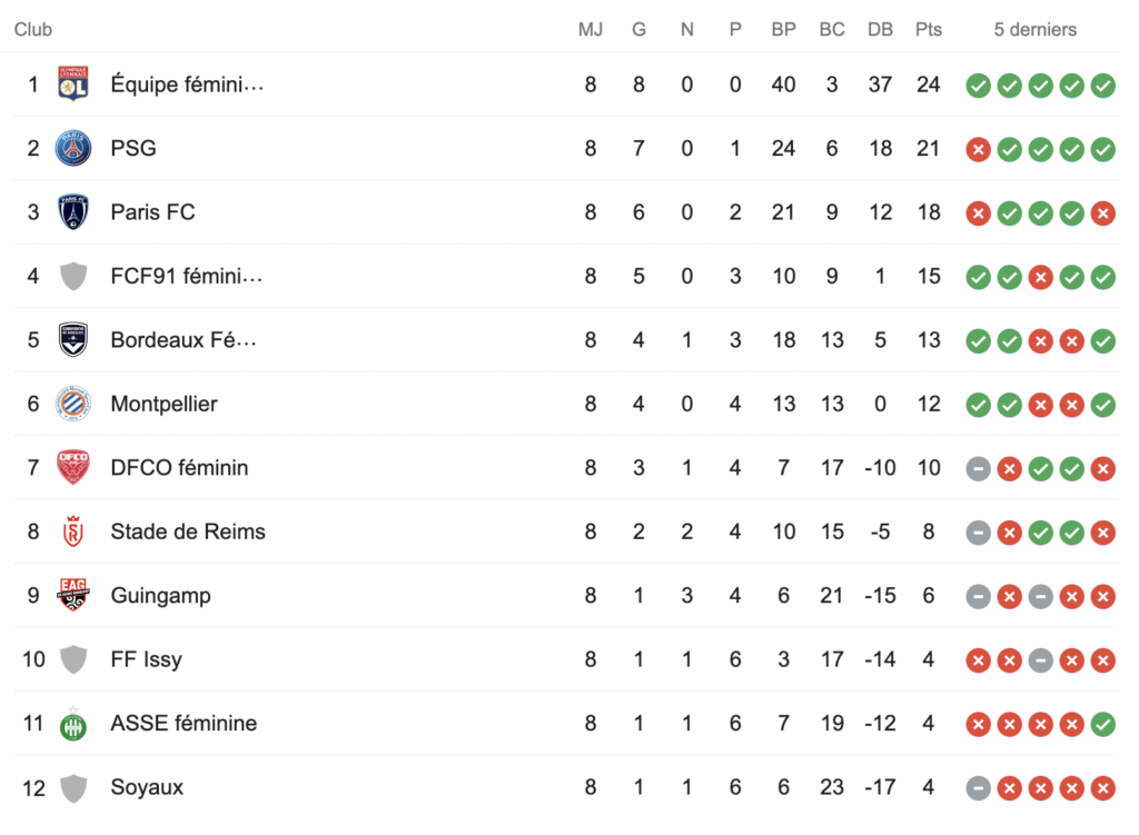 Ce week-end se tenait la 8e journée de championnat de football féminin. Cette journée a été l’occasion pour l’Olympique Lyonnais de s’imposer face à son plus grand adversaire, le PSG (6-1), tandis que le Stade de Reims et le DFCO, tout comme Guingamp et Soyaux se sont quittés sur un match nul (1-1 et 2-2). Bordeaux a de son côté pris le meilleur sur le Paris FC en s’imposant 1-3. Retrouvez ci-dessous l’ensemble des résultats.