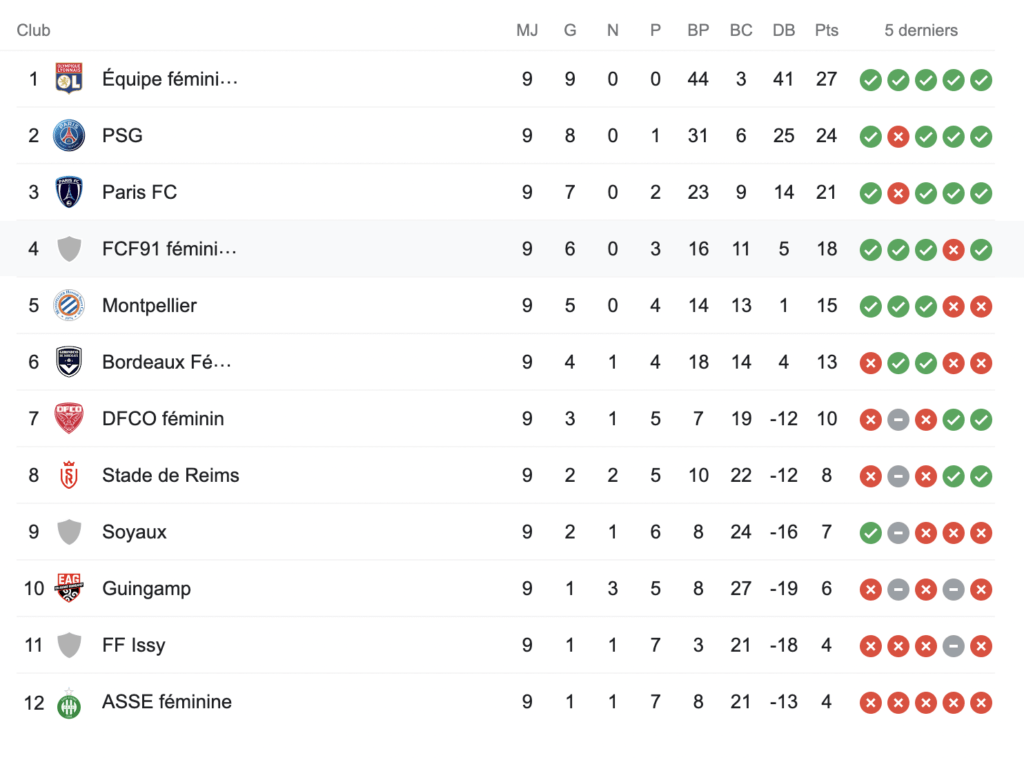 Ce week-end se tenait la 9e journée de championnat de football féminin. Cette journée a été l’occasion pour l’Olympique Lyonnais de de nouveau s’imposer face au FF Issy (0-4), tandis que le PSG s’est repris en s’adjugeant la victoire face à Reims (7-0). Soyaux a aussi signé un succès face à l’ASSE (2-1), tandis que Montpellier s’est défait de Bordeaux (0-1). Retrouvez ci-dessous l’ensemble des résultats.