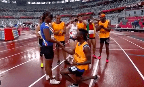 La sprinteuse a accepté la demande sous les applaudissements et, bague au doigt, a vite retrouvé le sourire.
