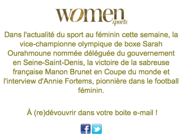La newsletter Women Sports du mardi 28 mars 2017 by Floriane Cantoro 9 ans ago FacebookTwitterWhatsappLinkedin Découvrez la newsletter Women Sports du 28 mars ! Abonnez-vous pour ne pas manquer la prochaine newsletter Women Sports ! Categories: News / Résultats Tags: Newsletter WOMEN SPORTS Articles associés Triathlon – Lisa Tertsch crée la surprise, Cassandre Beaugrand abandonne à Wollongong by Vanessa Maurel 19 octobre 2025 Tennis - Leylah Fernandez triomphe à Osaka après une finale disputée by Vanessa Maurel 19 octobre 2025 Patinage - Cizeron et Fournier Beaudry s’offrent l’or au Grand Prix de France by Vanessa Maurel 19 octobre 2025 Patinage - Ami Nakai, 17 ans, s’offre son premier Grand Prix en devançant la reine Sakamoto by womensports 18 octobre 2025 Football / LDC Féminine - Le PSG chute contre le Real Madrid by womensports 16 octobre 2025