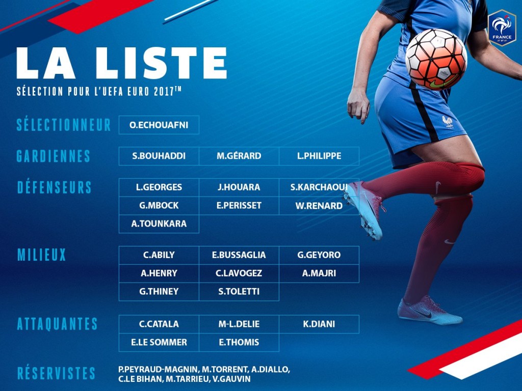 Le sélectionneur de l’Équipe de France féminine de football Olivier Echouafni a dévoilé la liste des joueuses retenues pour disputer l’Euro 2017 aux Pays-Bas du 16 juillet au 6 août lors d’une conférence de presse mardi.