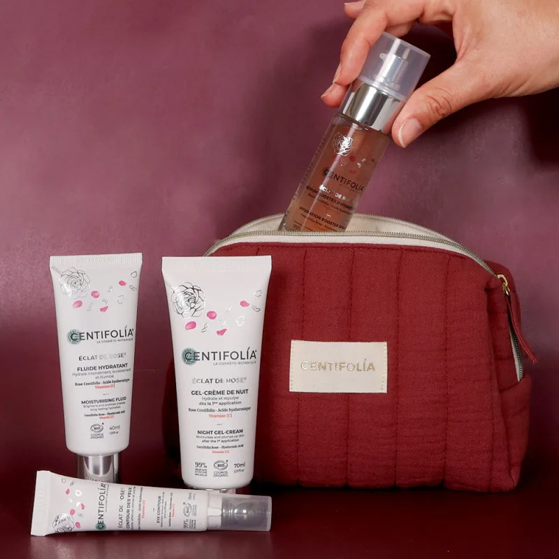 Pour celles qui cherchent une routine plus complète, capable d’accompagner la peau jour et nuit, la Trousse Éclat de Rose de Centifolia s’impose comme une valeur sûre. Inspirée de la rose Centifolia, elle coche toutes les cases chères aux sportives exigeantes. Hydratation durable, éclat naturel, textures fraîches qui pénètrent vite et laissent la peau confortable, même après l’entraînement. Le matin, le fluide hydratant réveille le teint sans alourdir. Le sérum apporte ce supplément de lumière qui fait la différence quand les traits sont marqués. Le contour des yeux aide à effacer les signes de fatigue accumulée. Et la nuit, le gel-crème agit pendant le sommeil, moment clé de la récupération, pour une peau reposée au réveil. Le tout dans une trousse en coton naturelle, pratique et élégante, facile à glisser dans un sac de sport ou une valise.