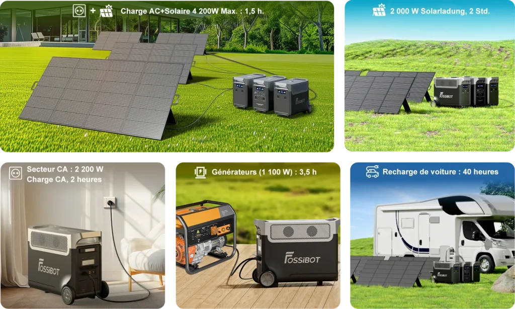 - ☀️ Entrée solaire jusqu’à 2 200 W : compatible avec plusieurs panneaux solaires, dont le Fossibot 420W, pour une recharge complète en 2,5 à 3 heures sous bon ensoleillement.