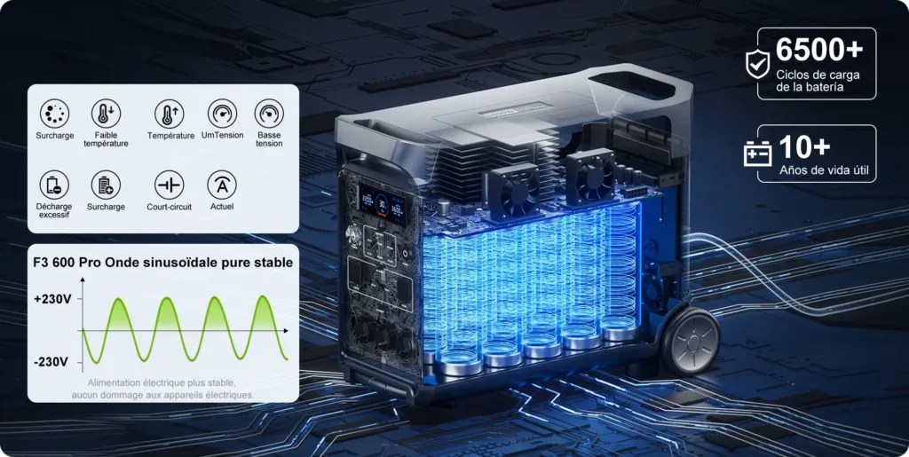 Le nom “F3600” n’est pas choisi au hasard : il fait référence à sa capacité colossale de 3 840 Wh et sa puissance de sortie de 3 600 W (avec un pic à 7 200 W). Autrement dit, assez pour faire fonctionner un mini-réfrigérateur, une cafetière, un mixeur, un ordinateur portable et même des outils électriques en simultané.
