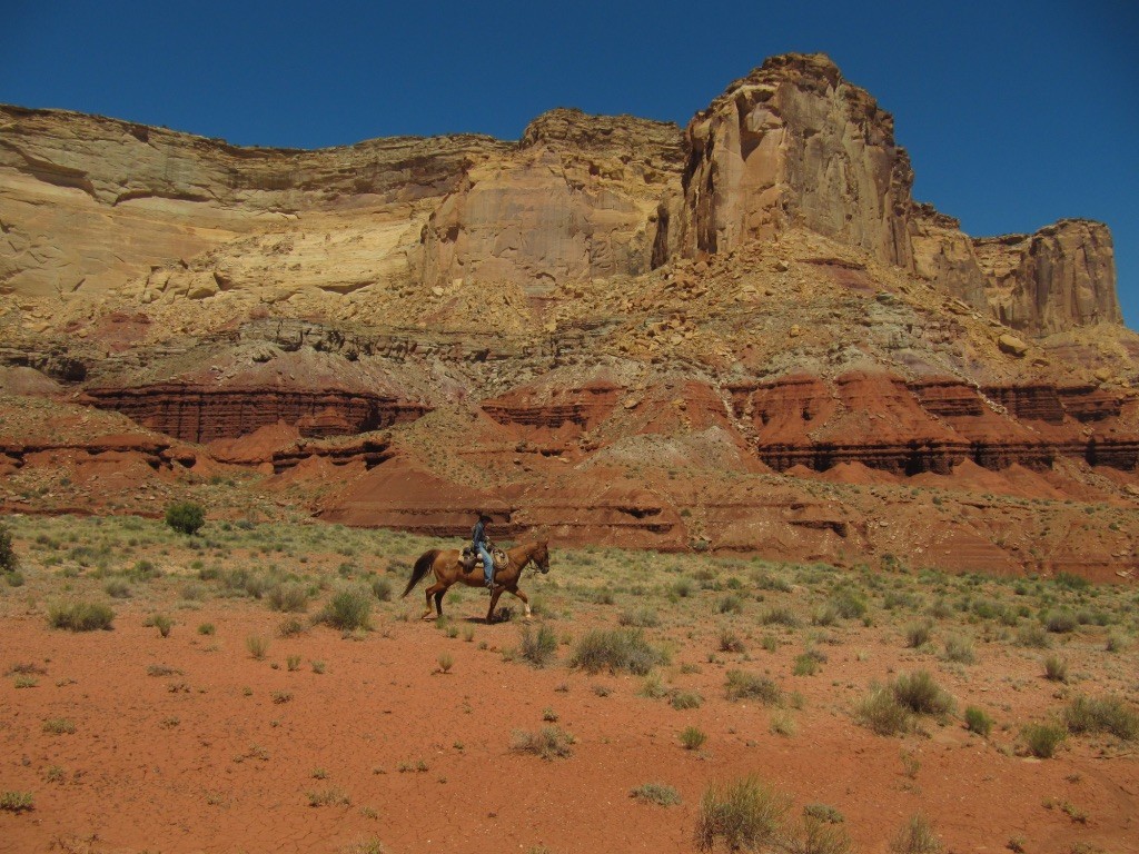 8h. Au saut du lit, on part en pick-up avec les chevaux pour le parc naturel de San Rafael Swell. Sans transition, on monte à cheval pour 3h de rando et on rejoint l’ancien camp minier de Muddy Creek.