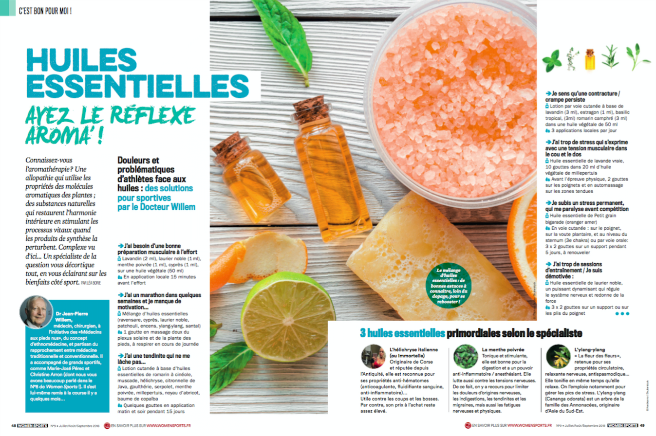 Il faut aussi soigner l’état général, restaurer l’organisme et booster les défenses, surtout chez les grands sportifs, à cause d’un grand turn-over métabolique ! On doit aussi surveiller l’état de la thyroïde, car l’hypothyroïdie est fréquente chez les sportives (20 % des femmes en souffrent). On prépare son organisme avec des pré-biotiques pour leurs caractéristiques anti-infectieuses. Et ensuite, on vient colmater avec les huiles essentielles en fonction de ses besoins. De bons moyens à connaître, loin du dopage, pour se rebooster. Tout simplement, l’aromathérapie, c’est passer du temps à s’occuper de soi. Des minutes précieuses pour retrouver son équilibre et renouveler ses réserves énergétiques.